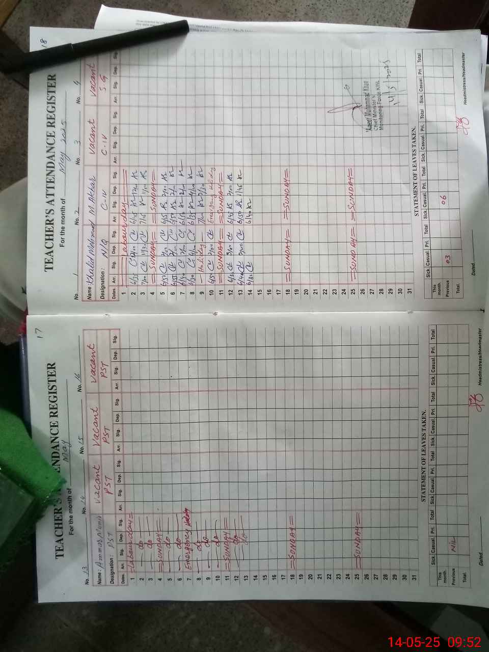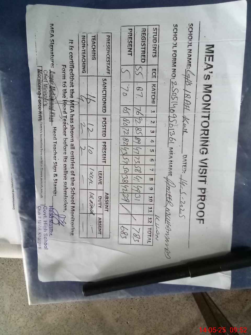 | Attendance Register | Head Teacher | MEA with School | Visit Proof |