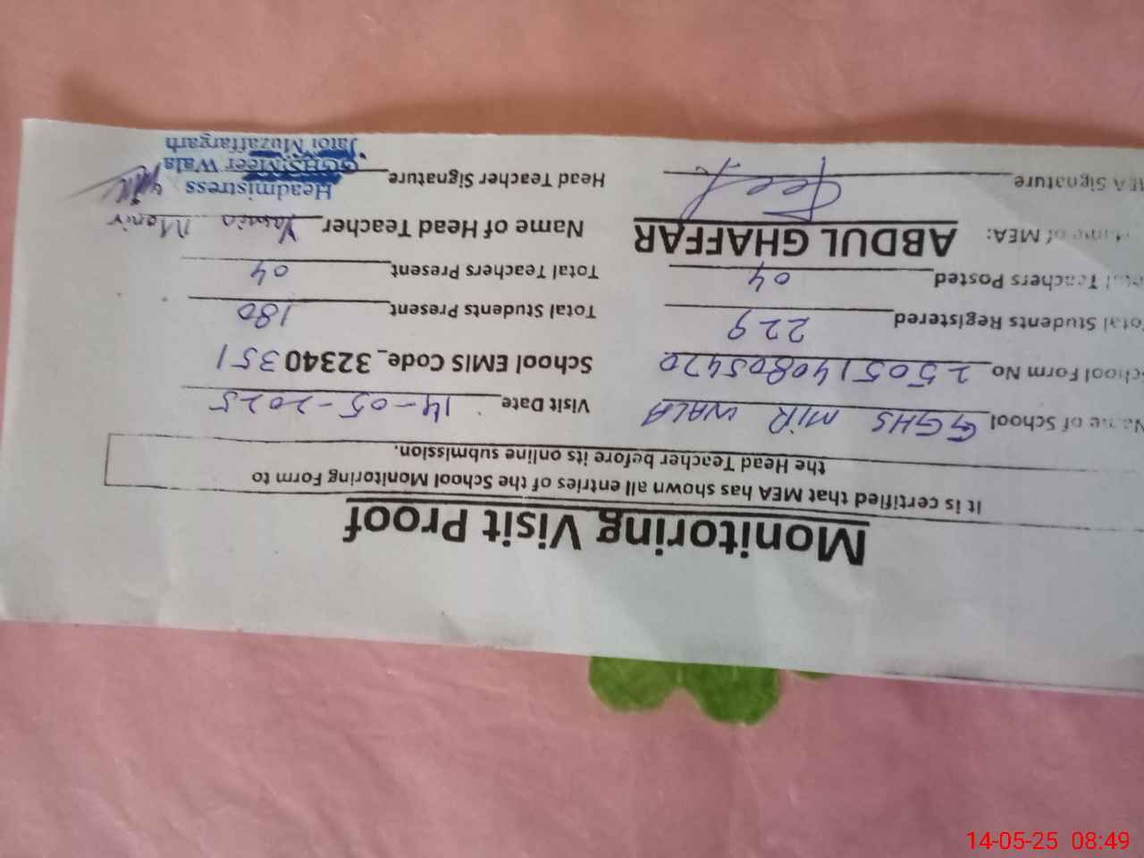 | Certified that this School was Inspected by the Undersigned MEA/DMO Today and the Information Stated Above is as Per Record. | |||||