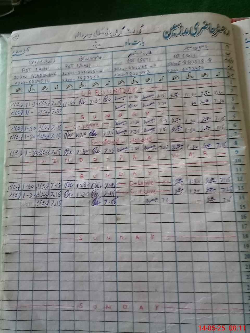 | CNIC | Full Name | Designation | R/C | Absence During Last Calender Month |