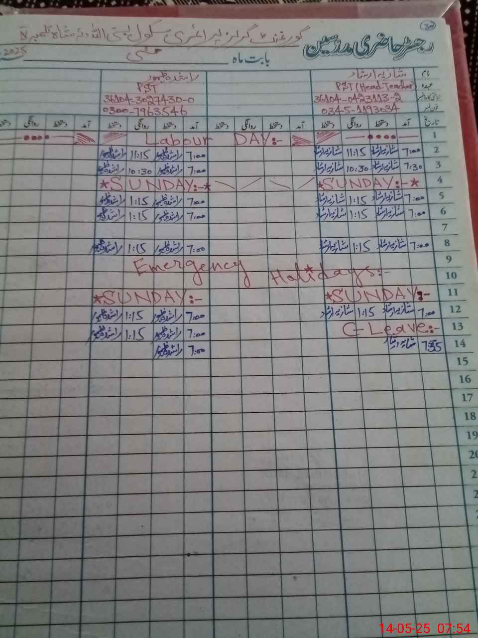 | Name: SH**** IR**** Designation: (School Headmaster's/Headmistress's) PST/PTC/JV Phone/Cell Number: 03**** |