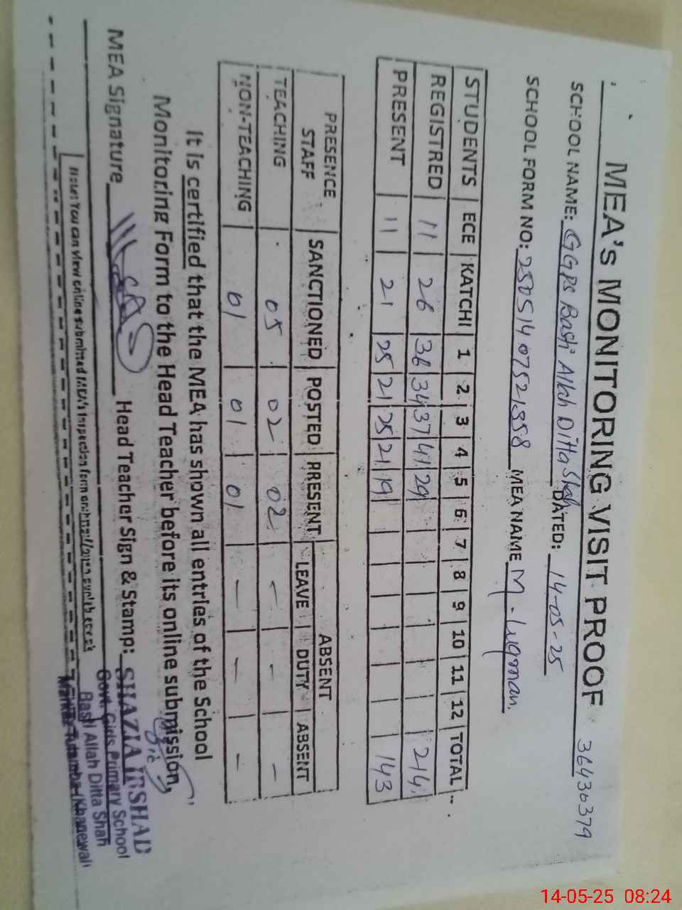 | Attendance Register | Head Teacher | MEA with School | Visit Proof |