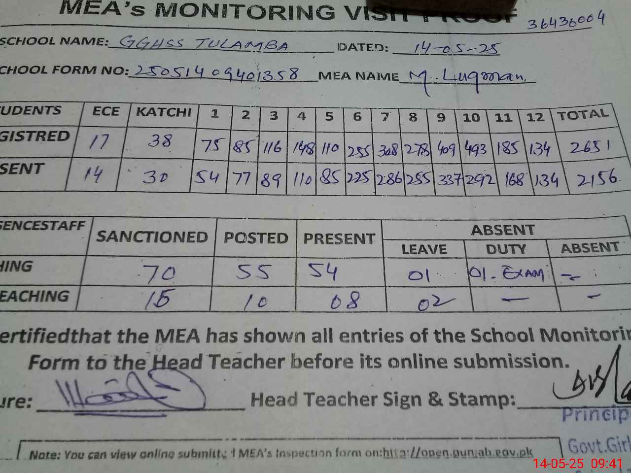 | Certified that this School was Inspected by the Undersigned MEA/DMO Today and the Information Stated Above is as Per Record. | |||||