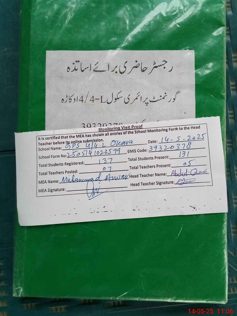 | District: OKARA | Tehsil: OKARA | Markaz: 4/4-L-MALE | Level: Primary | |