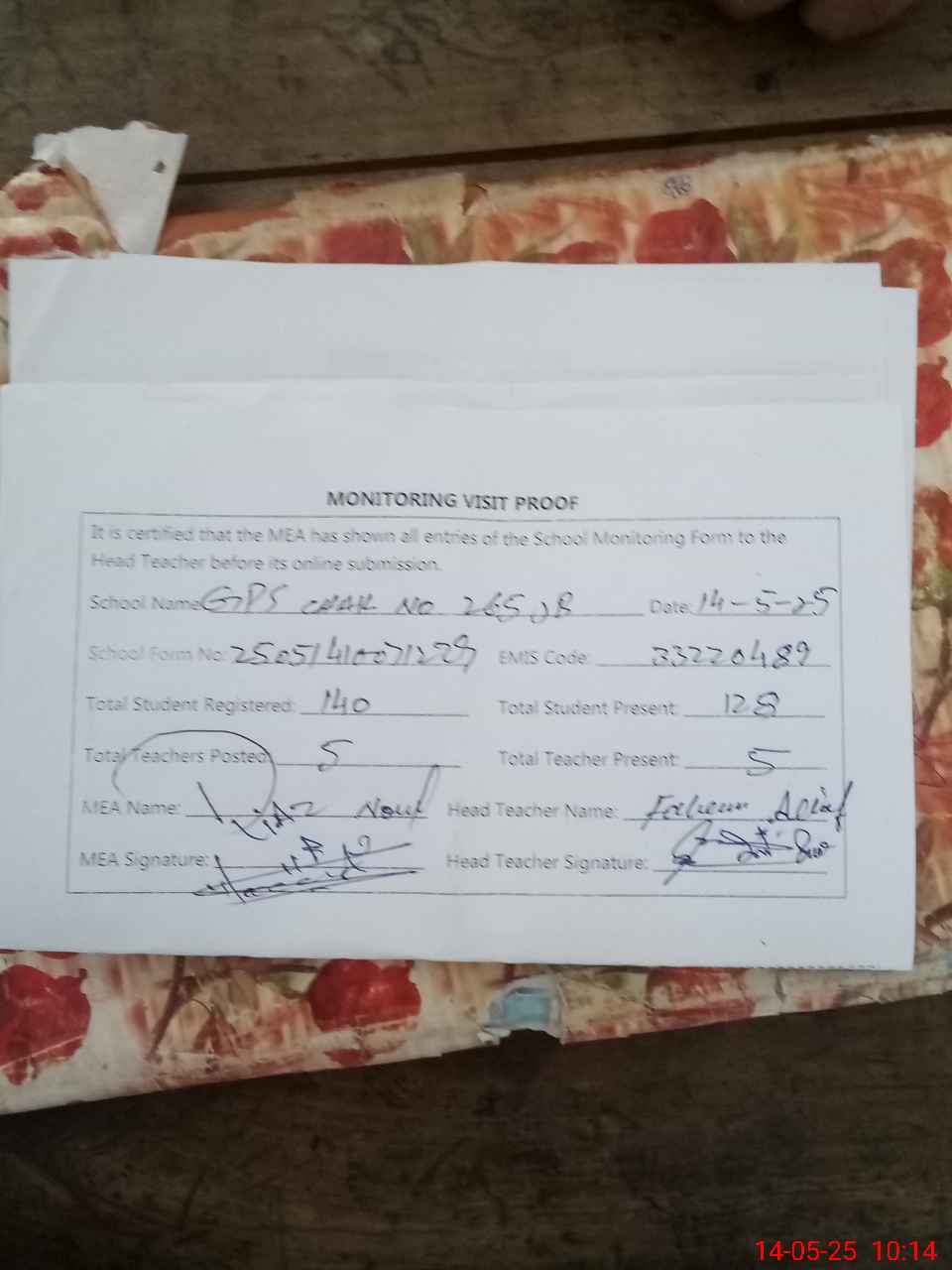 | Attendance Register | Head Teacher | MEA with School | Visit Proof |