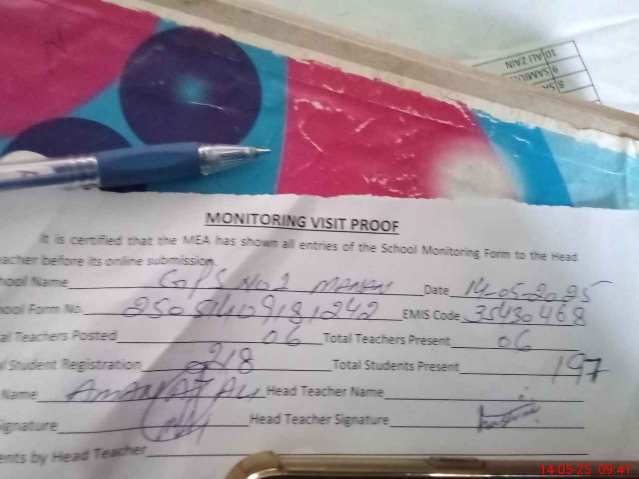 | Attendance Register | Head Teacher | MEA with School | Visit Proof |
