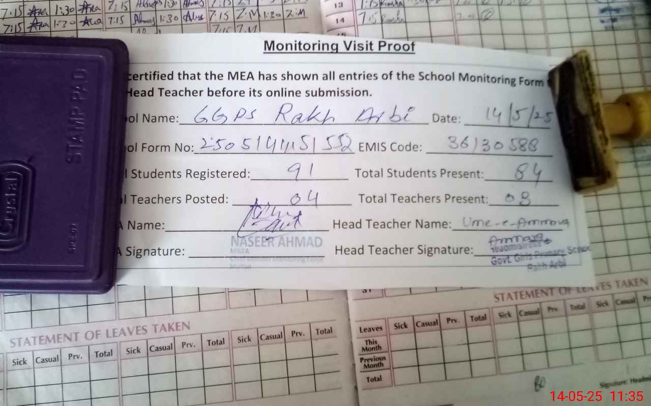 | Attendance Register | Head Teacher | MEA with School | Visit Proof |