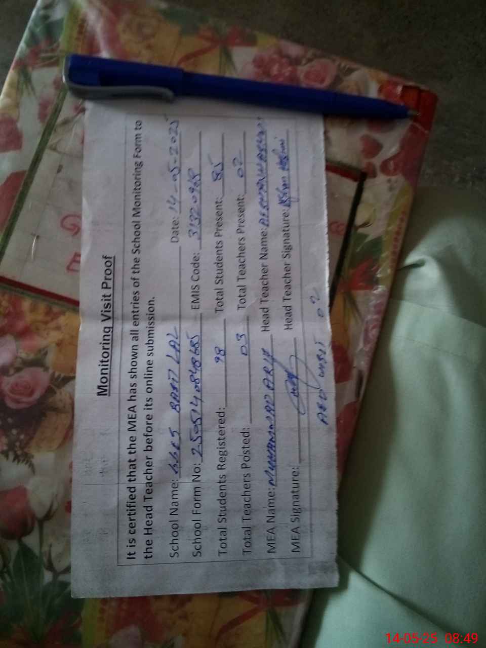 | Attendance Register | Head Teacher | MEA with School | Visit Proof |