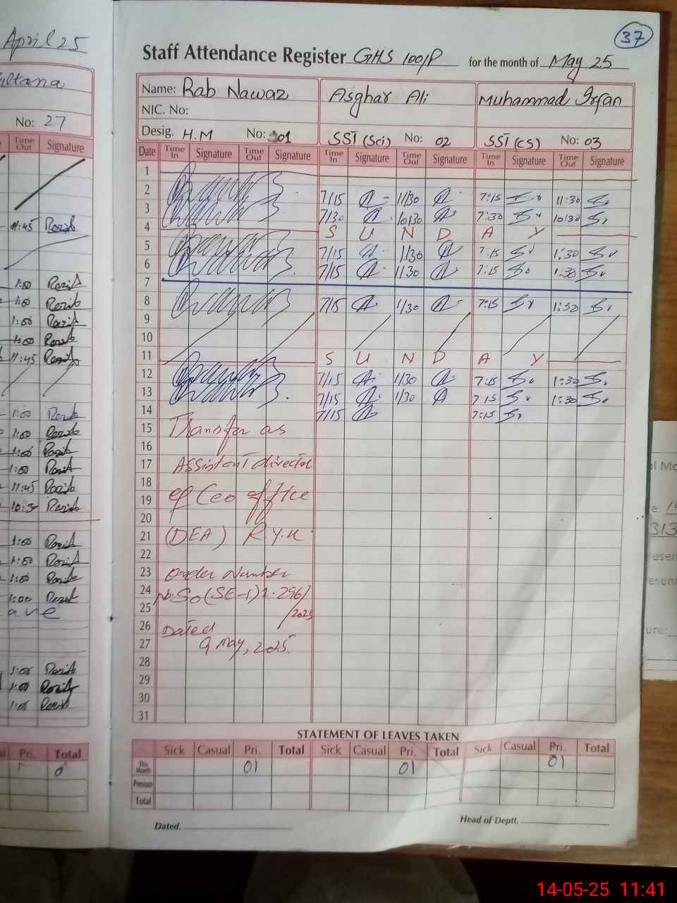 | CNIC | Full Name | Designation | R/C | Absence During Last Calender Month |
