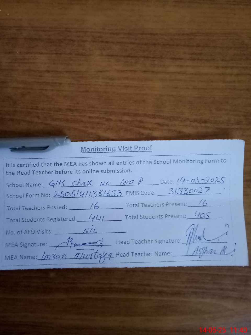 | Attendance Register | Head Teacher | MEA with School | Visit Proof |