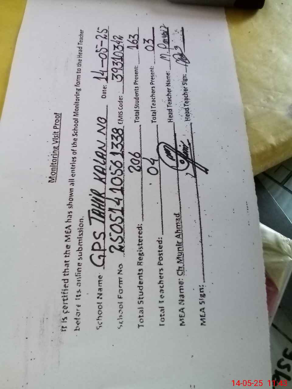| Attendance Register | Head Teacher | MEA with School | Visit Proof |