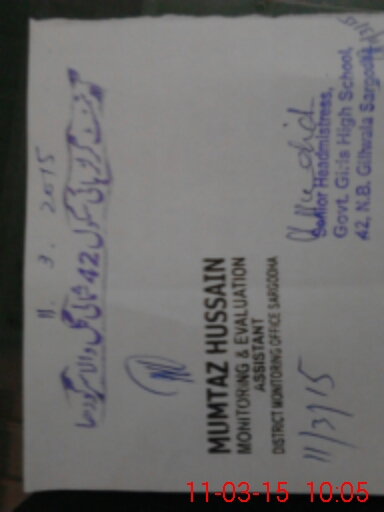 | EMIS Code: 38420077 | Name of School: GGHS CHAK NO.42 NB GILL WALA | |||