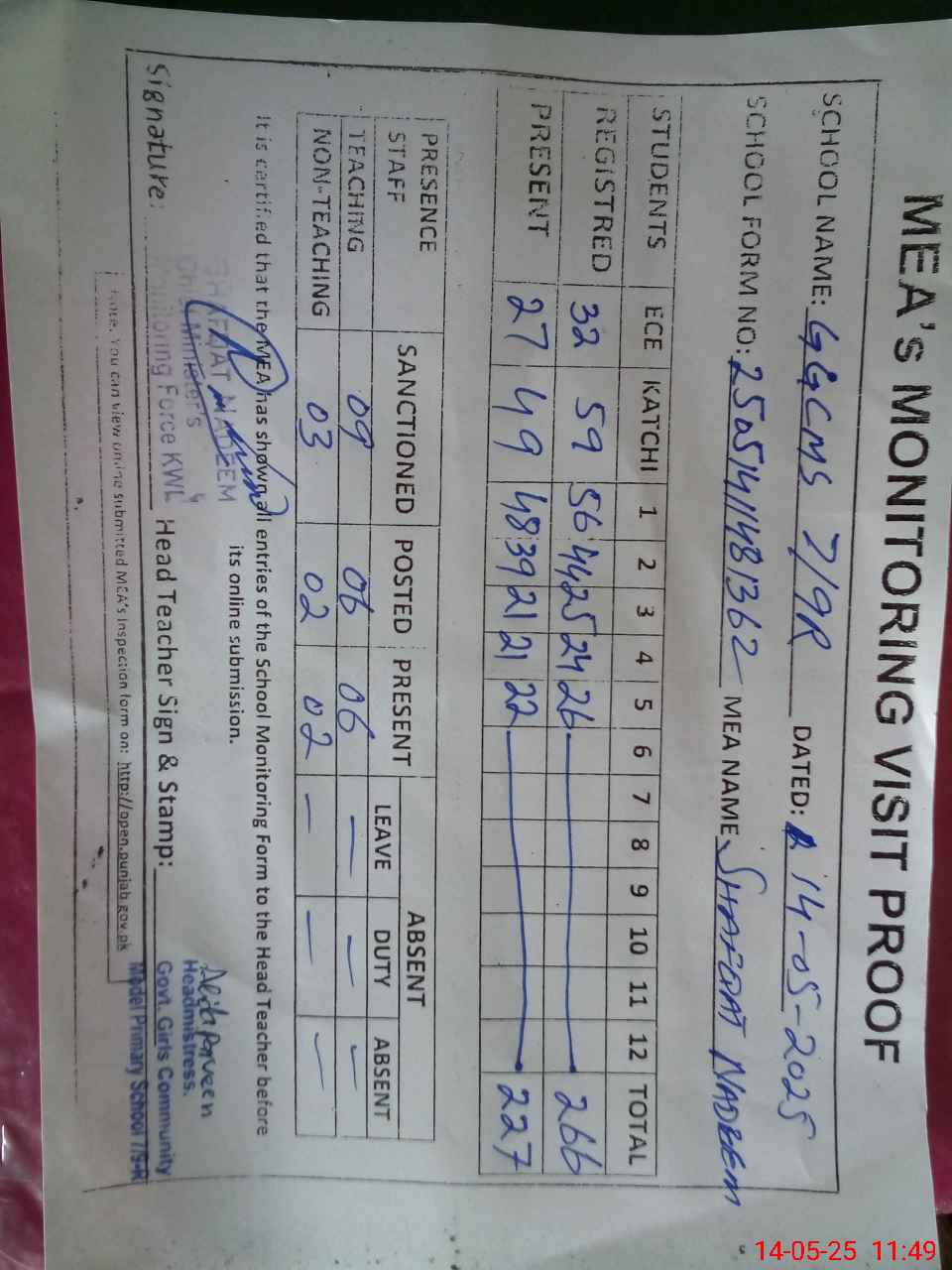 | Attendance Register | Head Teacher | MEA with School | Visit Proof |