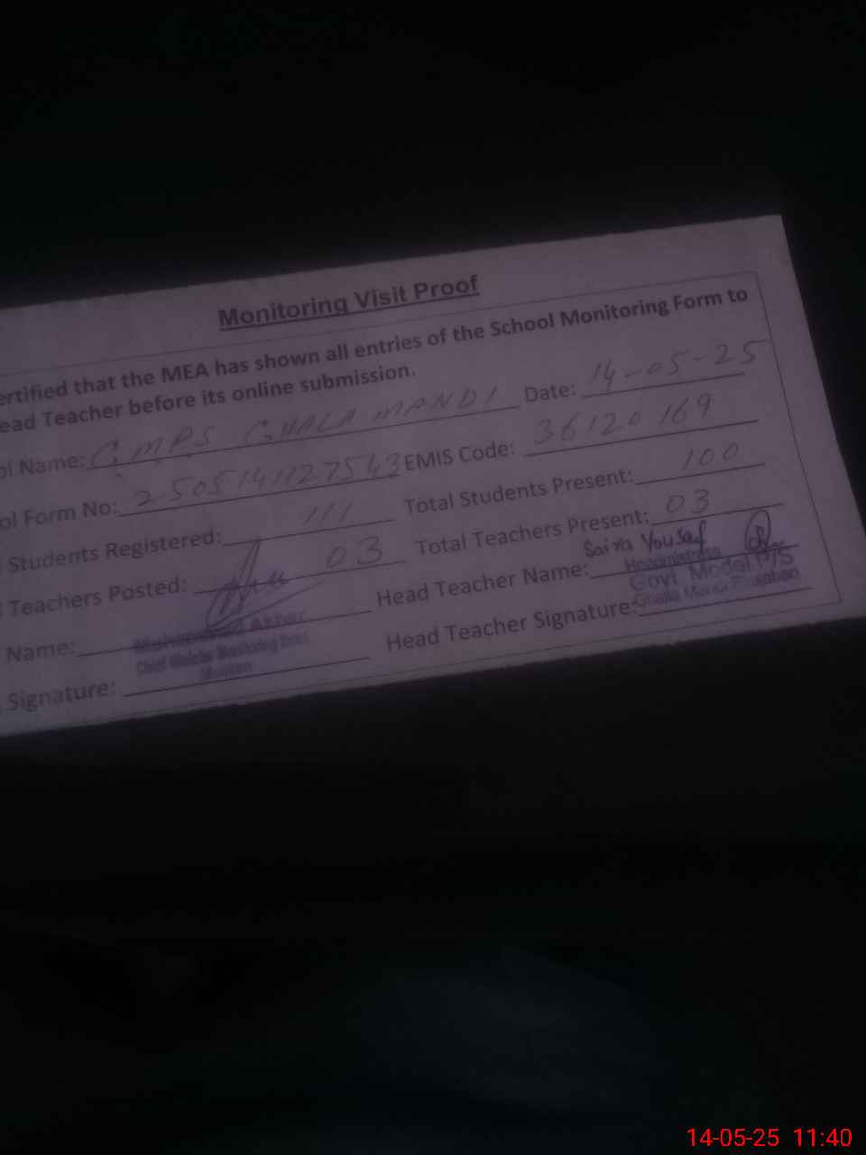 | Attendance Register | Head Teacher | MEA with School | Visit Proof |