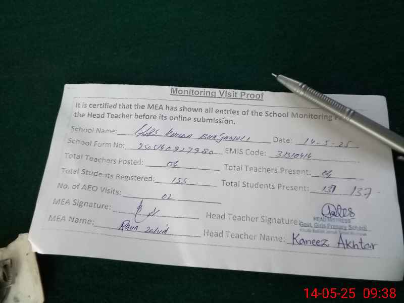| Attendance Register | Head Teacher | MEA with School | Visit Proof |
