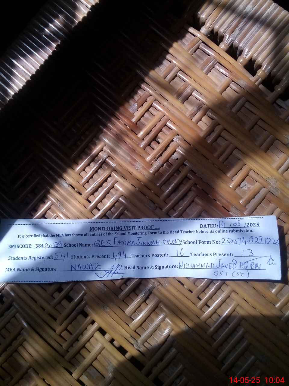 | Certified that this School was Inspected by the Undersigned MEA/DMO Today and the Information Stated Above is as Per Record. | |||||