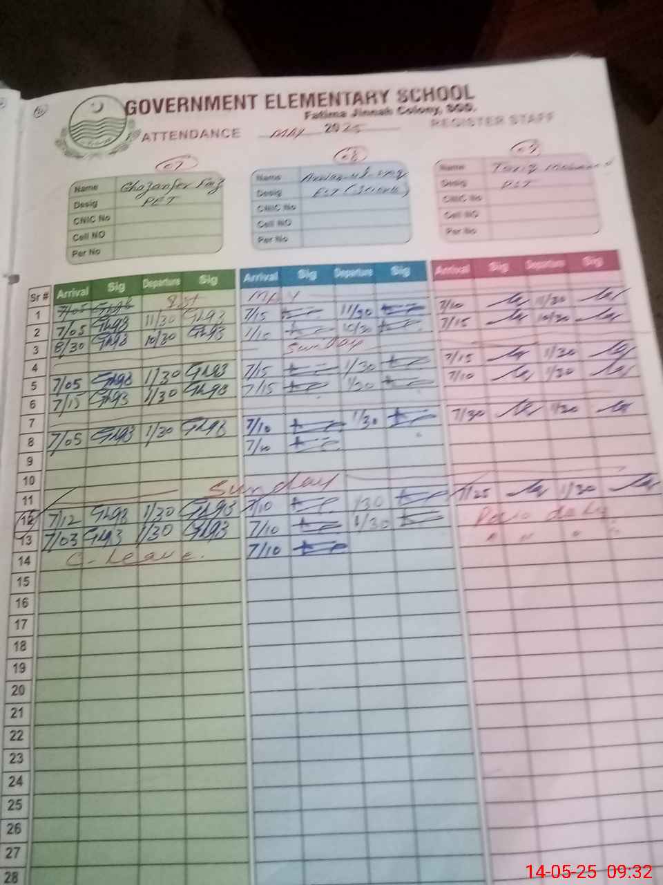 | CNIC | Full Name | Designation | R/C | Absence during last cal. month |