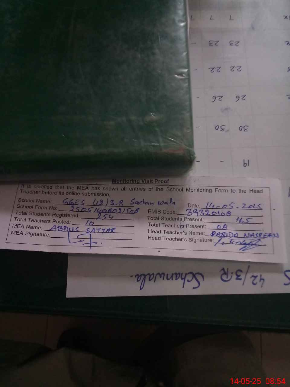 | Attendance Register | Head Teacher | MEA with School | Visit Proof |