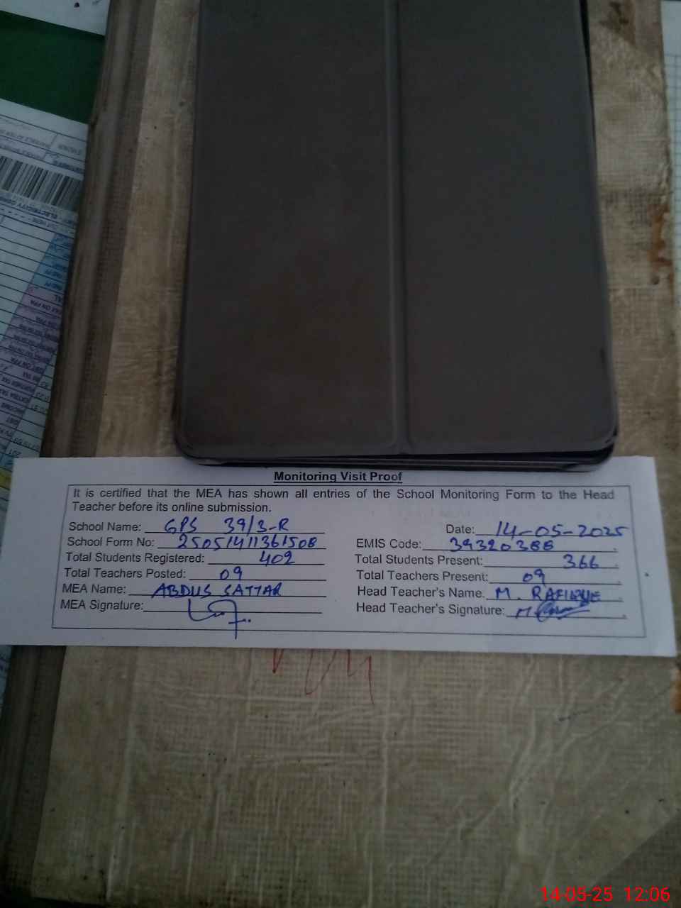 | Attendance Register | Head Teacher | MEA with School | Visit Proof |