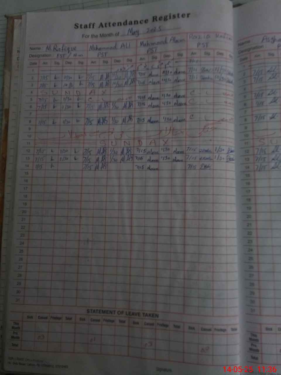 | CNIC | Full Name | Designation | R/C | Absence During Last Calender Month |