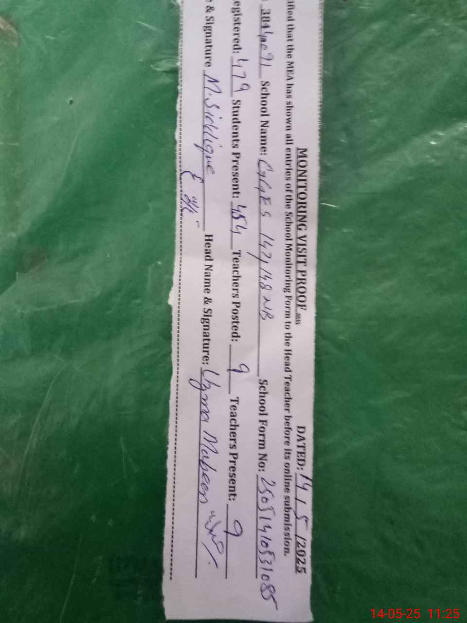 | Attendance Register | Head Teacher | MEA with School | Visit Proof |