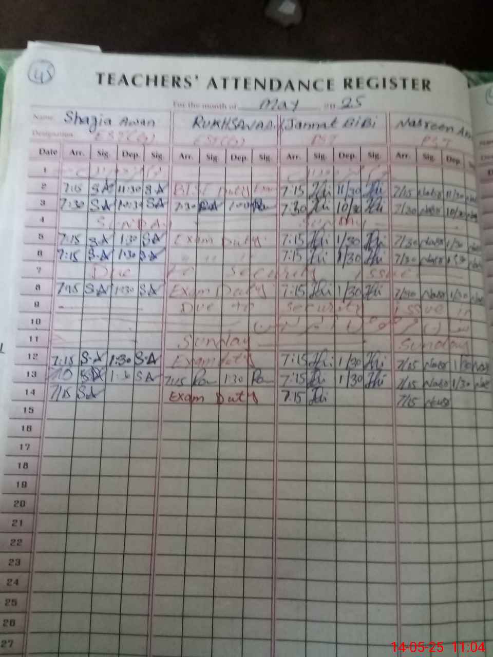 | 38**** | Ru**** Ar**** | EST | Regular | 0 | 0 | 0 | 0 | 0 | 0 | 0 | 0 | 0 | Exam Duty |