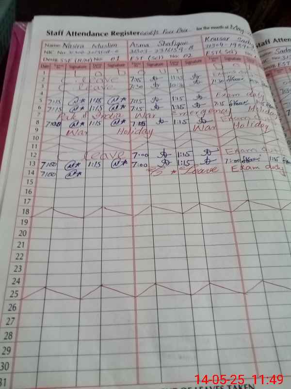 | CNIC | Full Name | Designation | R/C | Absence During Last Calender Month |