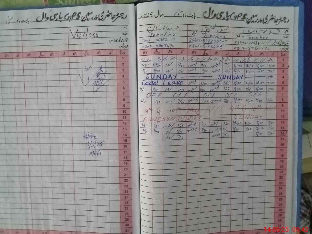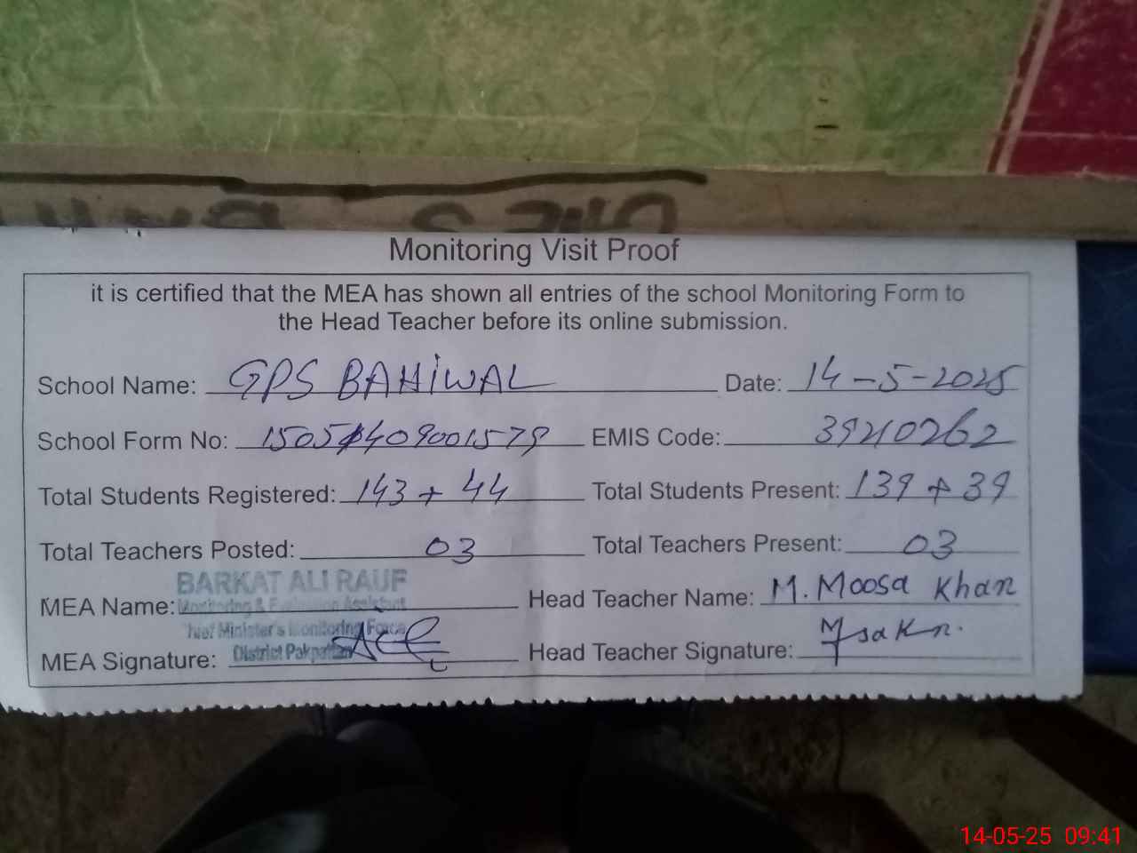 | Attendance Register | Head Teacher | MEA with School | Visit Proof |