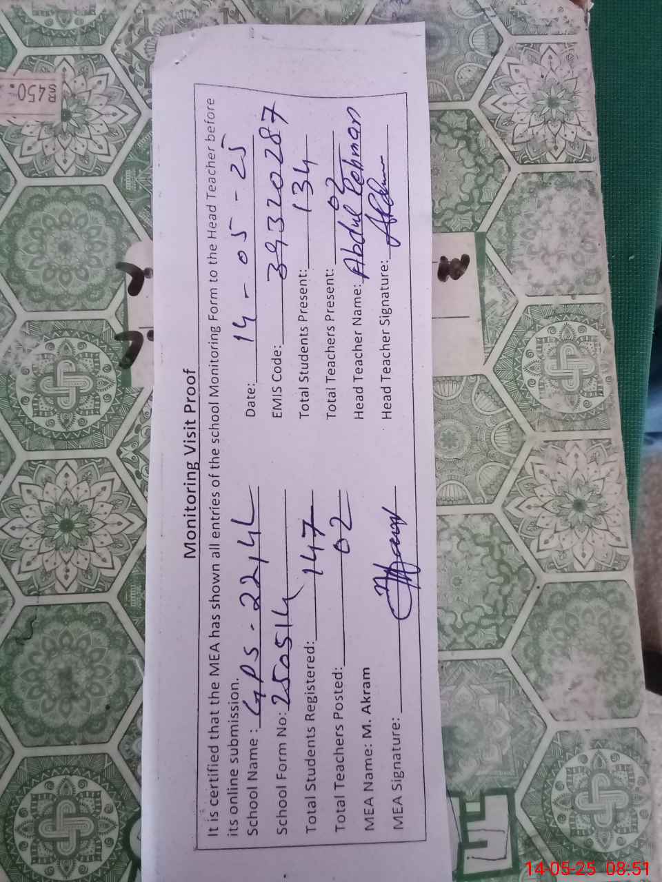 | Attendance Register | Head Teacher | MEA with School | Visit Proof |