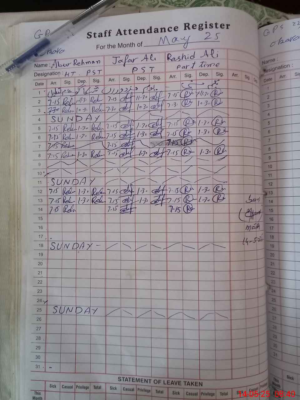 | CNIC | Full Name | Designation | R/C | Absence During Last Calender Month |