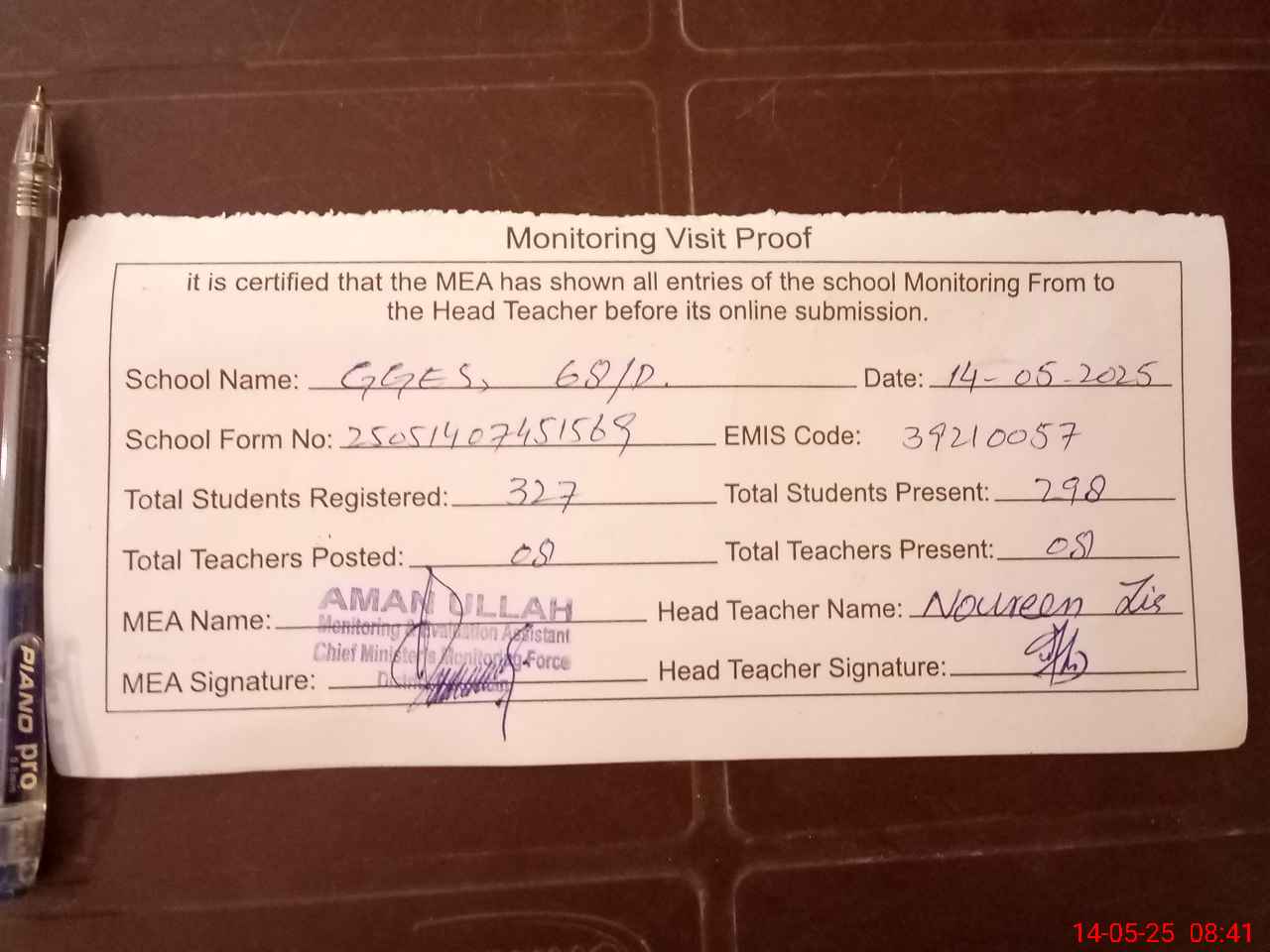| Certified that this School was Inspected by the Undersigned MEA/DMO Today and the Information Stated Above is as Per Record. | |||||