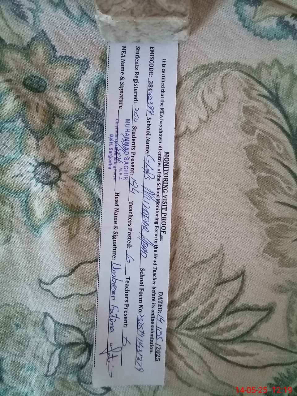 | Certified that this School was Inspected by the Undersigned MEA/DMO Today and the Information Stated Above is as Per Record. | |||||