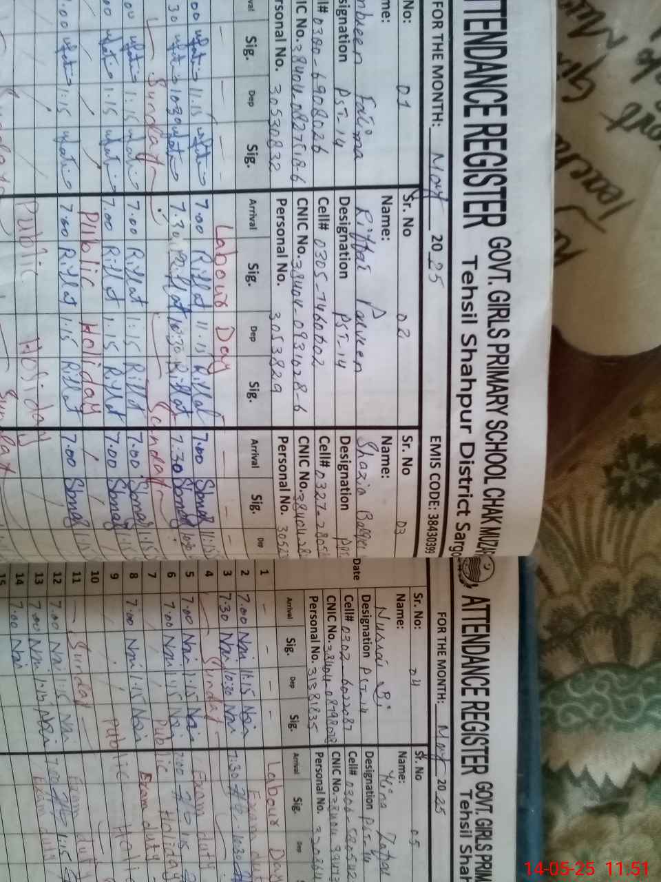 | CNIC | Full Name | Designation | R/C | Absence During Last Calender Month |
