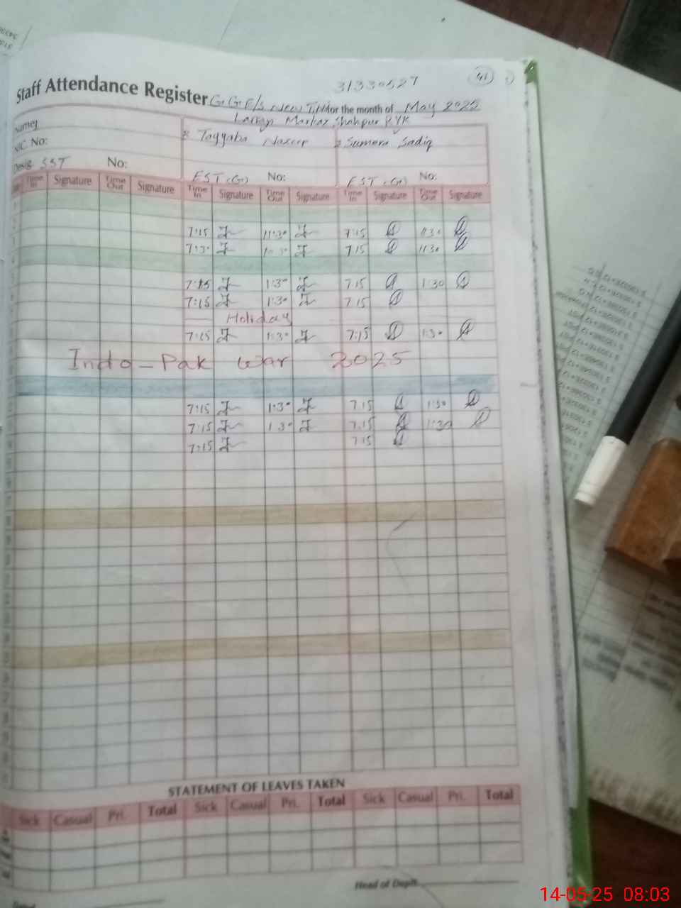 | Leave | Duty | Absent | Maternity | Medical | Ex- Pak |