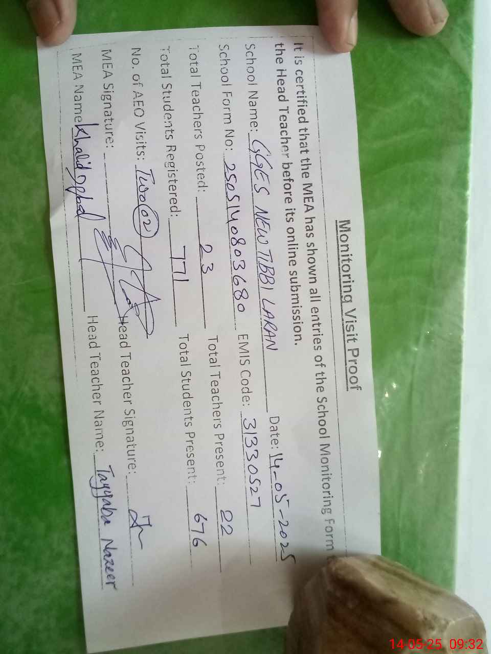| Attendance Register | Head Teacher | MEA with School | Visit Proof |