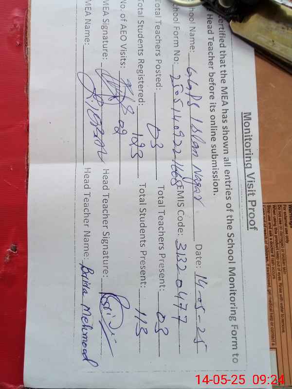 | Attendance Register | Head Teacher | MEA with School | Visit Proof |