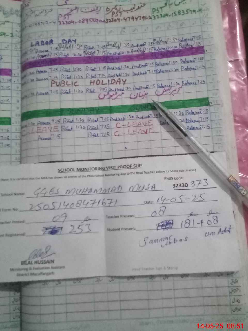 | Attendance Register | Head Teacher | MEA with School | Visit Proof |