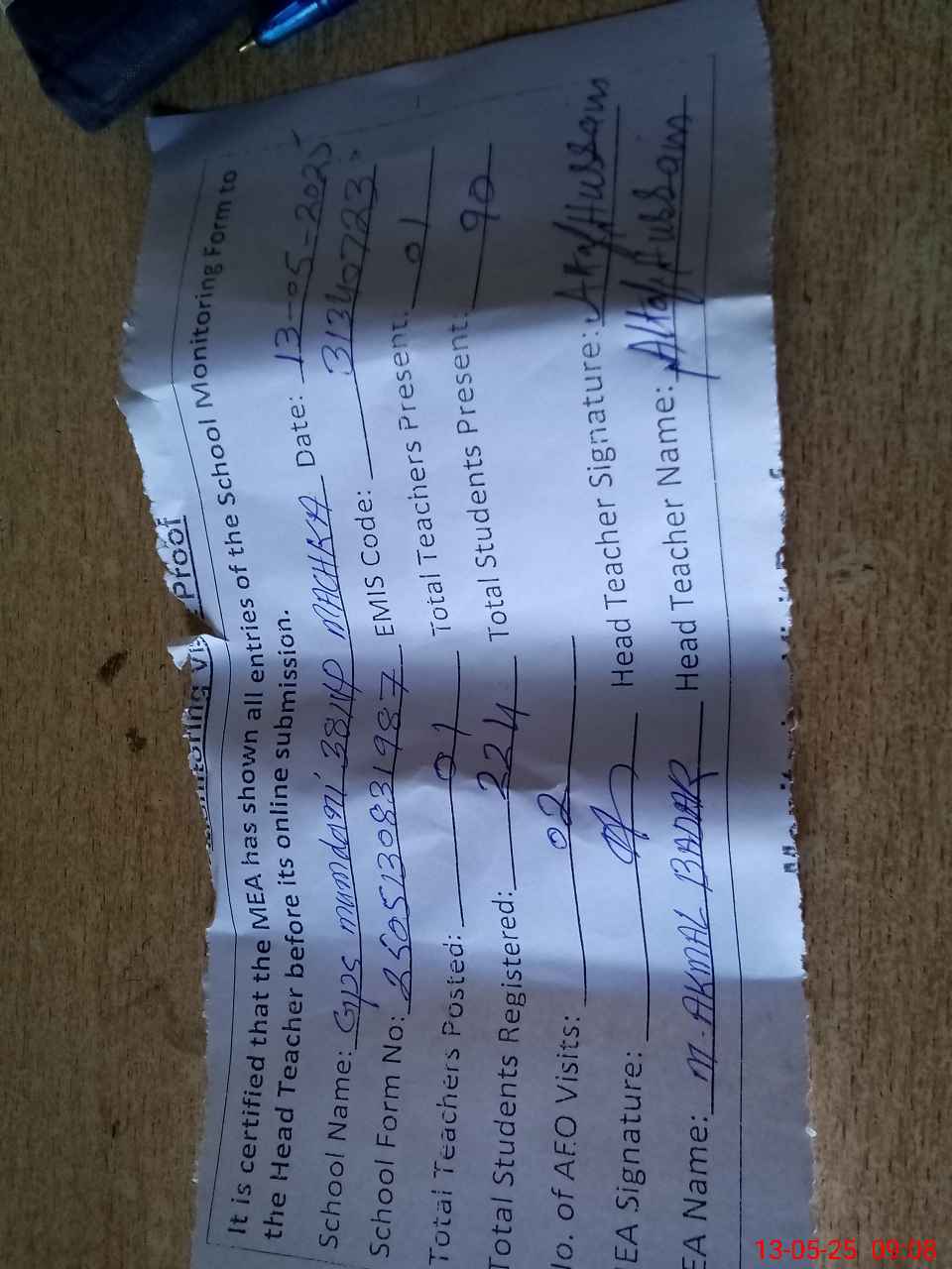 | Attendance Register | Head Teacher | MEA with School | Visit Proof |