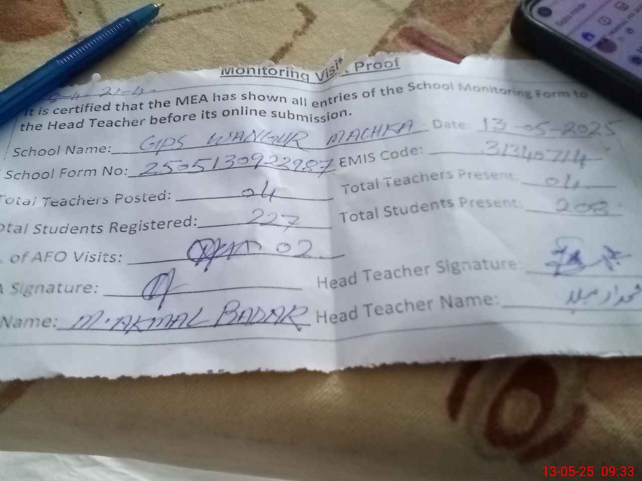| Attendance Register | Head Teacher | MEA with School | Visit Proof |