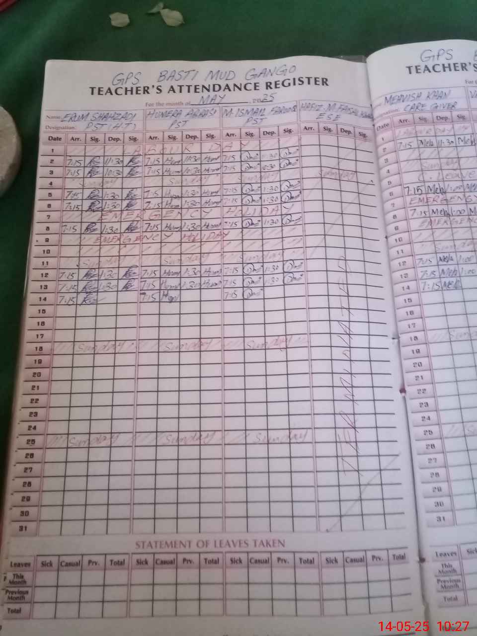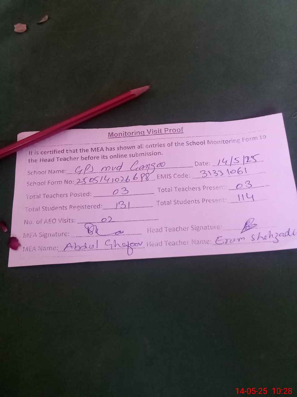 | Attendance Register | Head Teacher | MEA with School | Visit Proof |