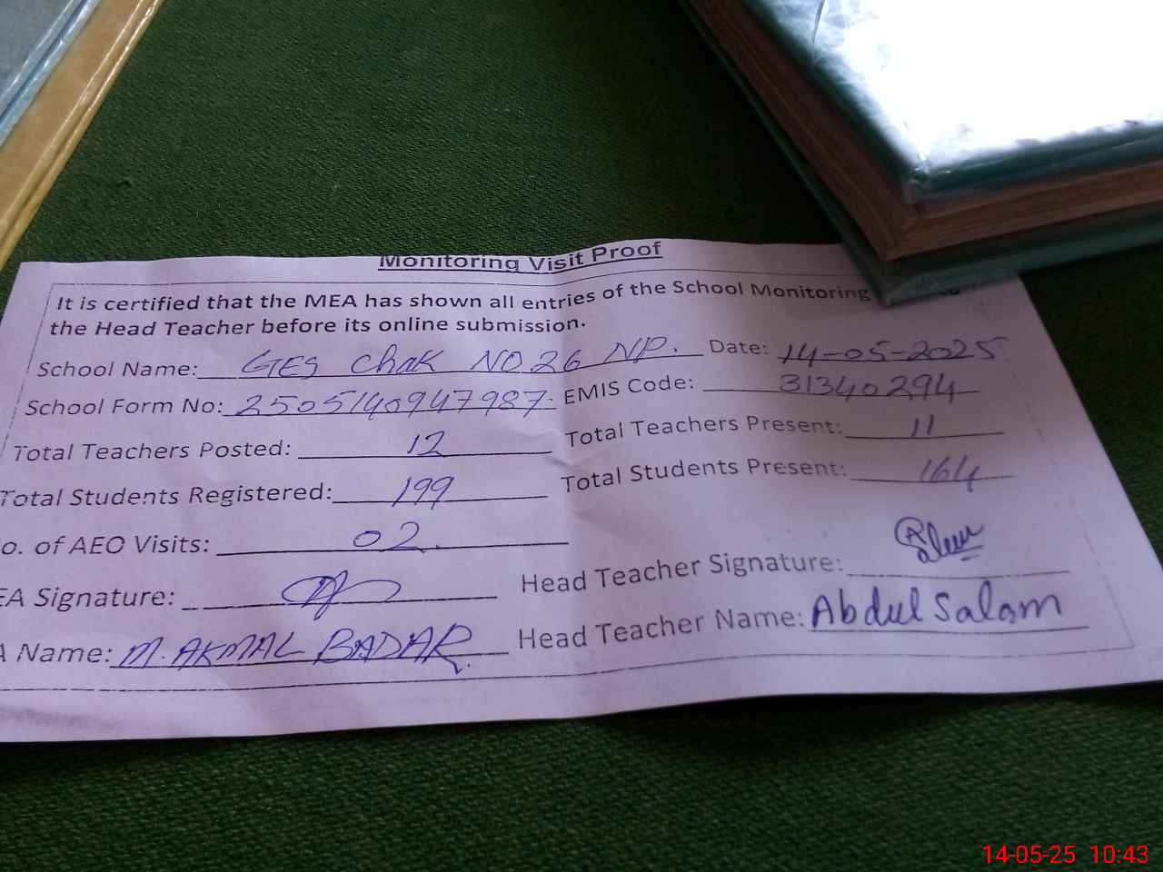 | Attendance Register | Head Teacher | MEA with School | Visit Proof |