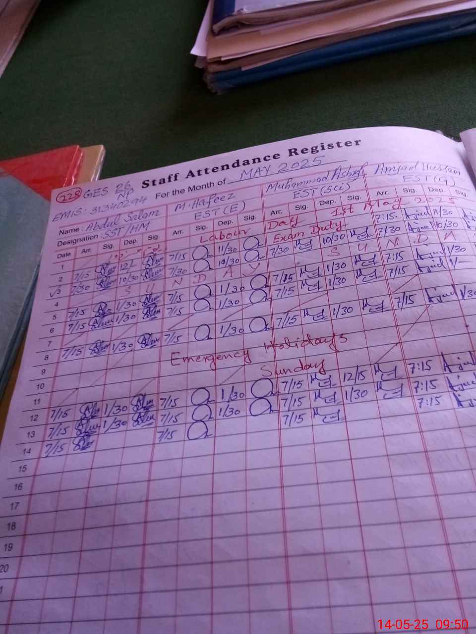 | Monitoring Date: 14-05-2025 | Start Time: 14-05-2025 09:47 AM | End Time: 14-05-2025 10:43 AM | Name of MEA: Mu**** Ak**** Ba**** | |