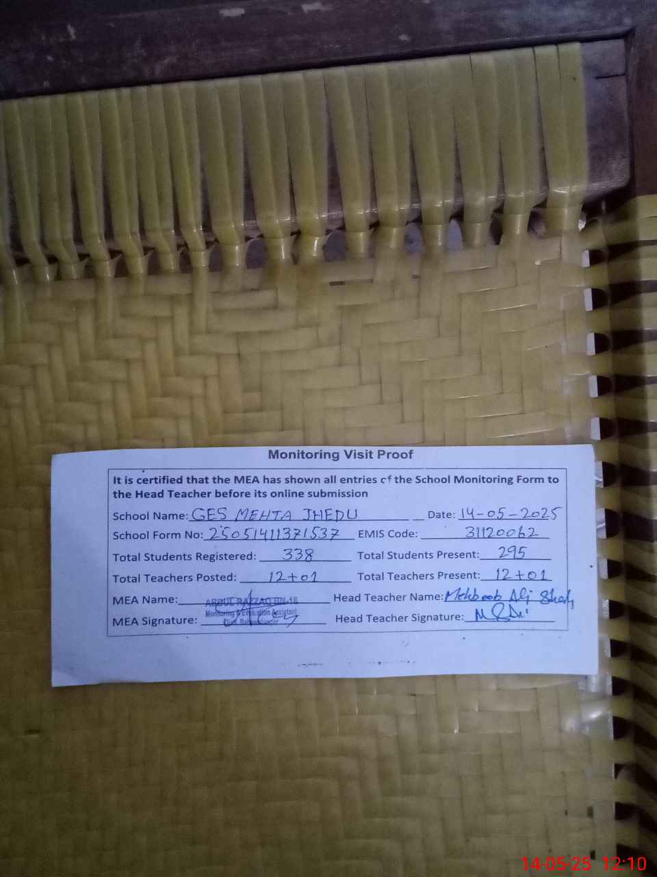 | Attendance Register | Head Teacher | MEA with School | Visit Proof |