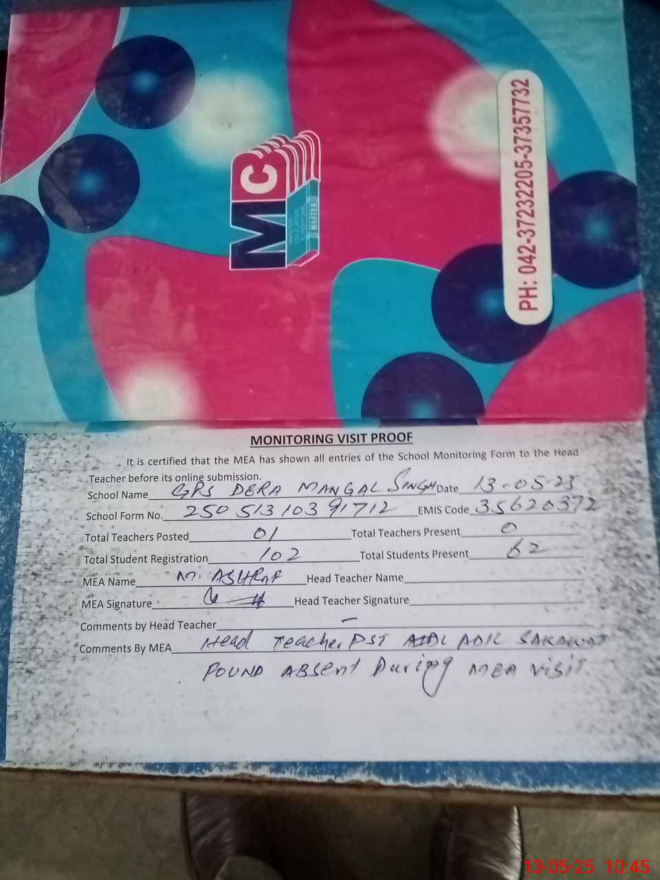 | EMIS Code: 35620372 | Name of School: GPS DERA MANGAL SINGH | |||