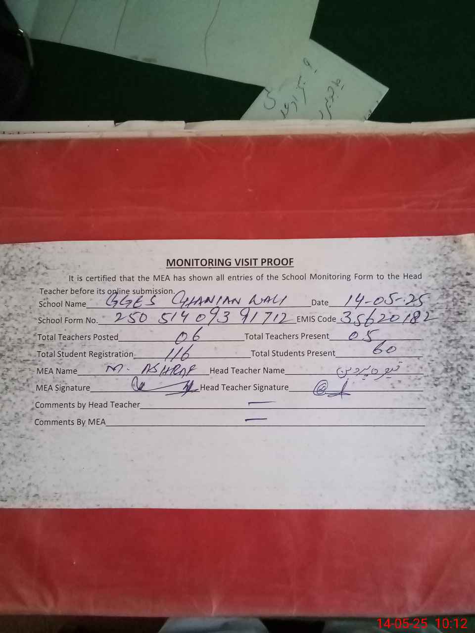 | EMIS Code: 35620182 | Name of School: GGES CHANIAN WALI | |||