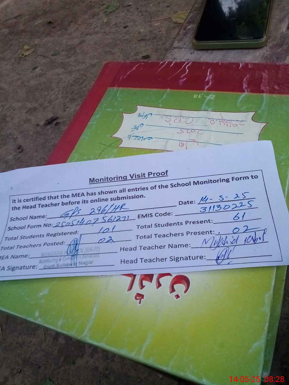 | Attendance Register | Head Teacher | MEA with School | Visit Proof |