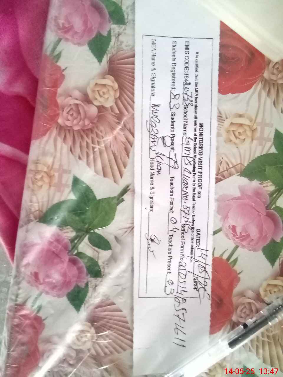 | Attendance Register | Head Teacher | MEA with School | Visit Proof |