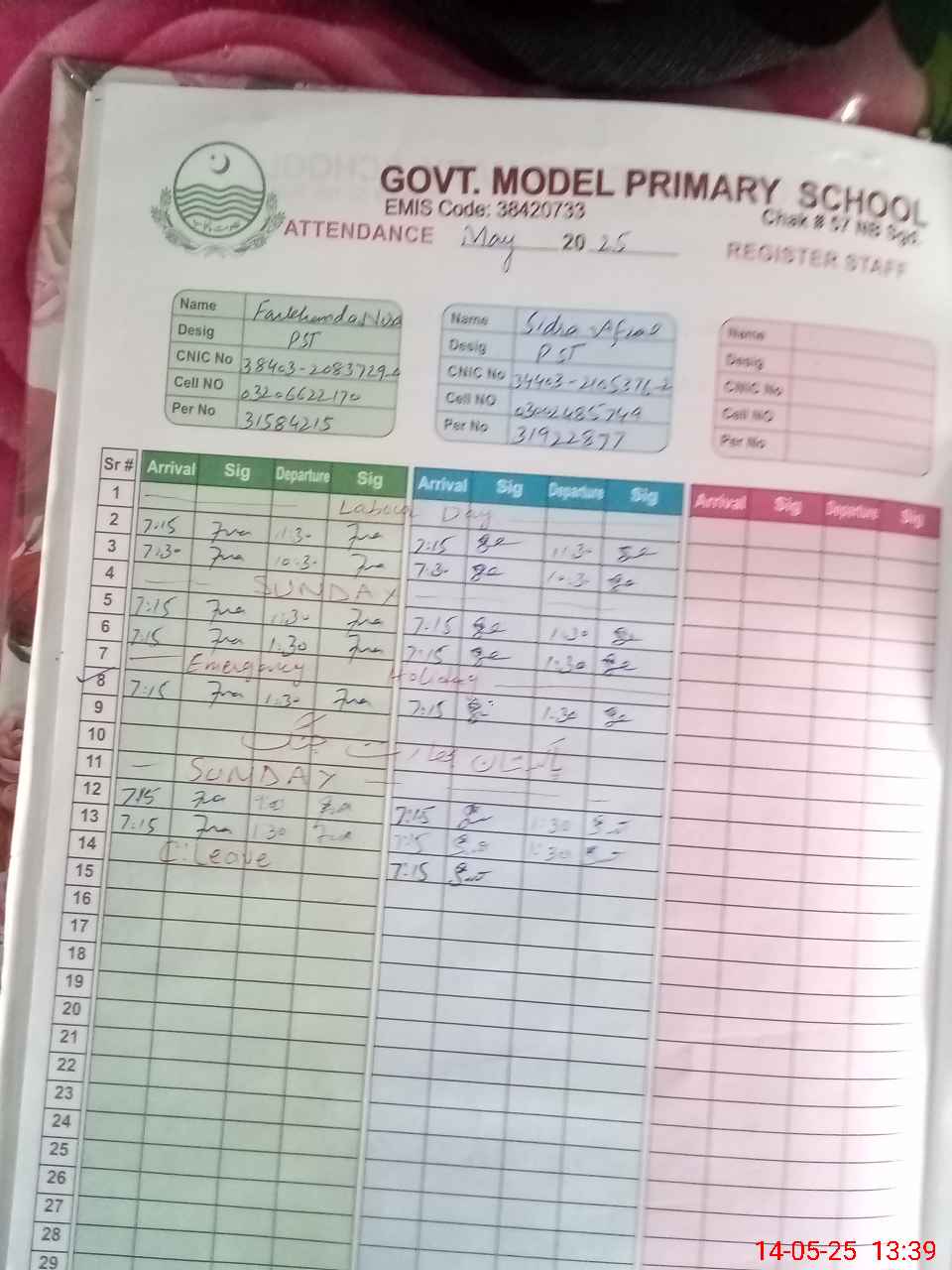 | CNIC | Full Name | Designation | R/C | Absence During Last Calender Month |