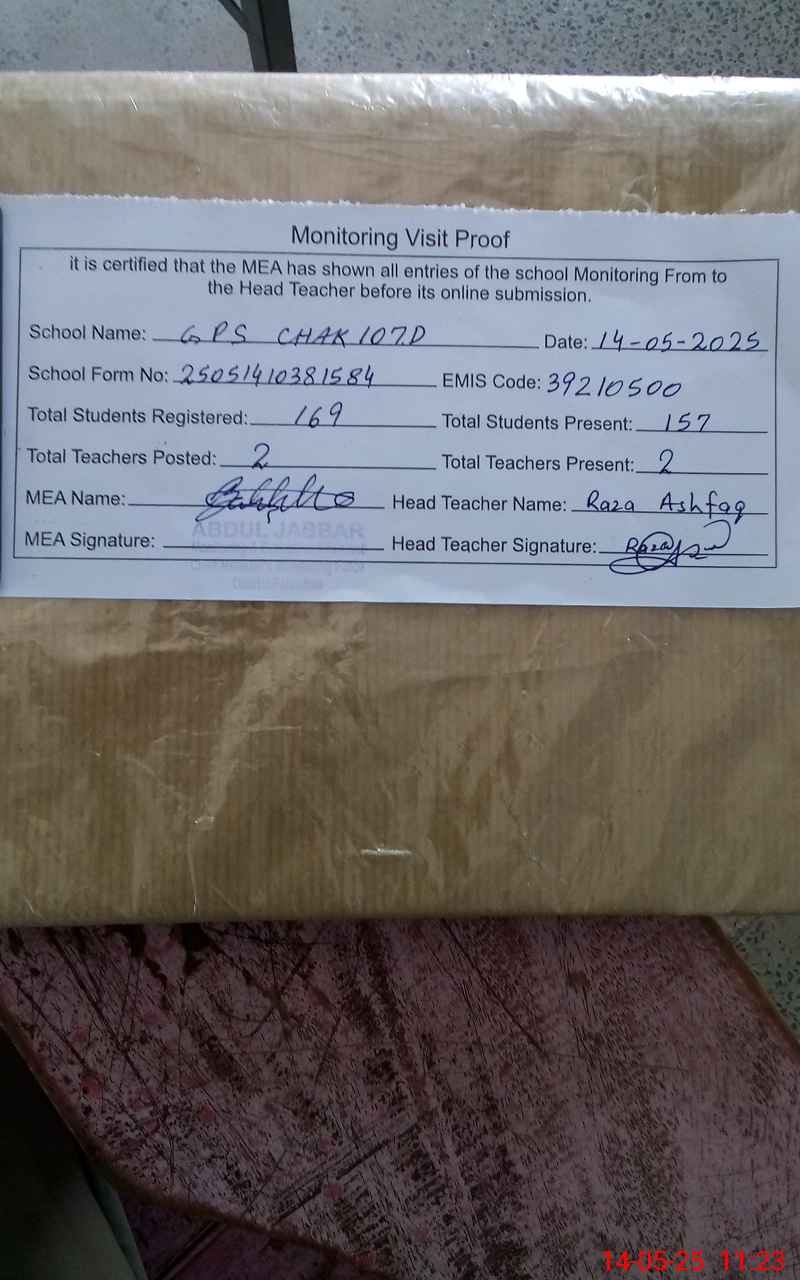 | EMIS Code: 39210500 | Name of School: GPS CHAK NO. 107 /D | |||