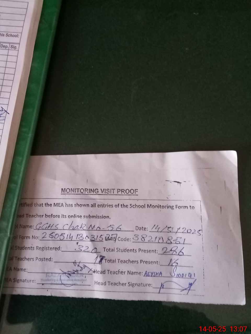 | Attendance Register | Head Teacher | MEA with School | Visit Proof |