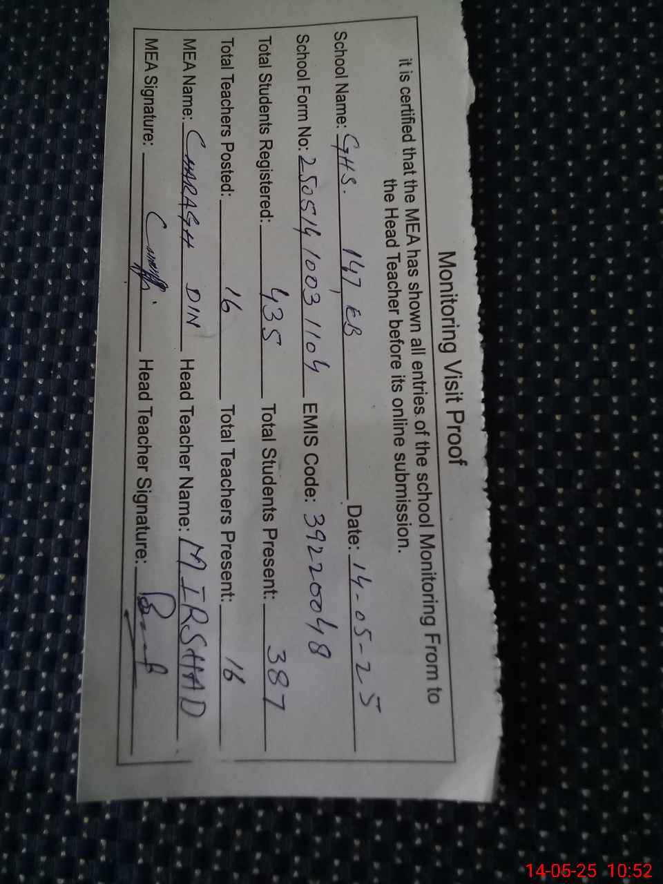| EMIS Code: 39220048 | Name of School: GHS 147 EB | |||